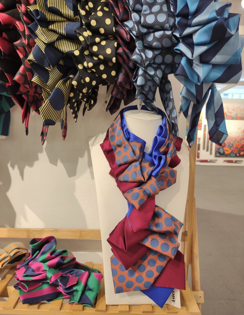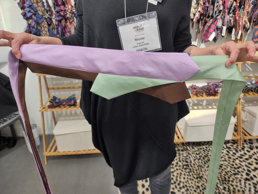 Nicole Deponte transforms men’s neckties into intricately folded ascots and brooches that command your attention. She takes an item of traditional menswear that we are accustomed to seeing worn one way, and makes it into unique sculptural apparel, something that people of any gender can wear.