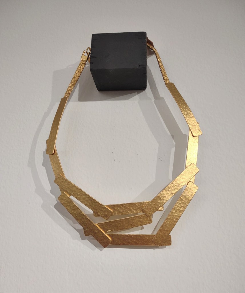“We are trying to name this necklace. Do you have any ideas?” Elena asked me. She was wearing the necklace in question, which looked to me like golden logs scattered in a fireplace.