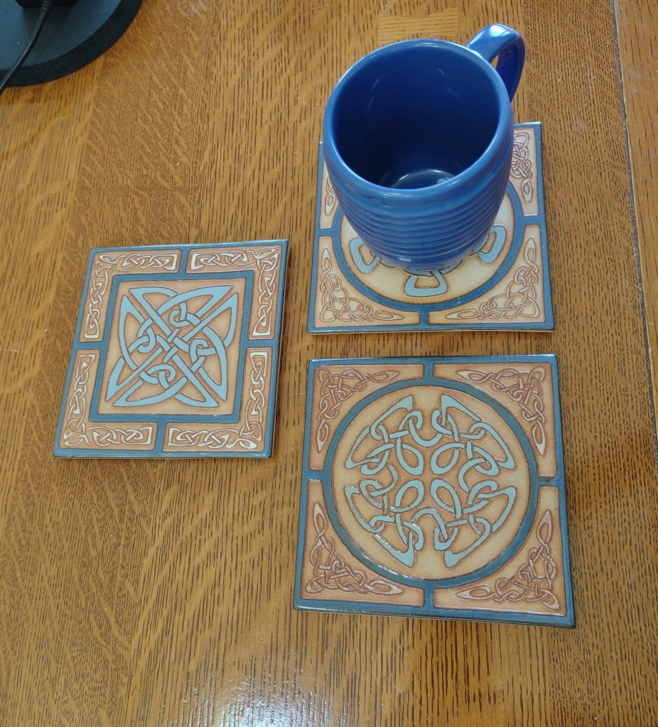 See these Celtic Knot Tiles from Earthen Craft Pottery My husband and I discovered these amazing Celtic tiles with intricate knotwork designs at Milwaukee Irish Fest a few years ago. Available in several color combinations, these Celtic Knot Tiles are handmade by the artisans of Earthen Craft Pottery, a small pottery shop in Lansing, MI. These 6-inch tiles are perfect as extra-large coasters or trivets. Earthen Craft also sells framed tiles and wall plaques with a Celtic theme.