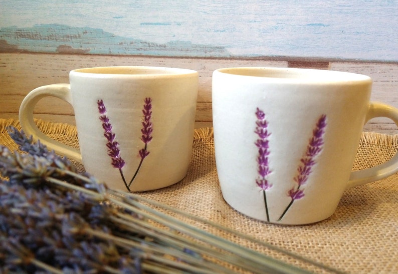 See this Lavender Mug on Etsy Two small sprigs of lavender are just right for a minimalist aesthetic. These mugs hold about 10-12 oz. and have a tendency to sell out, so get them while they are available! Made by Sachisunnycreation of Seattle, WA.