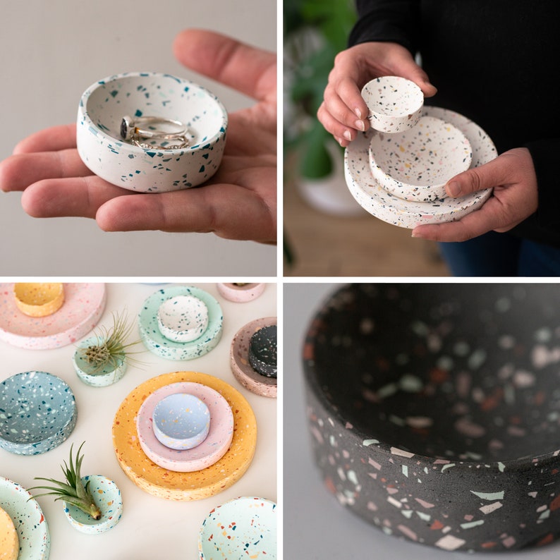See these Short Squiggle Vases on Etsy These fun vases are made from pastel-colored concrete terrazzo by SpecklGoods of Grand Rapids, MI. This company also makes candleholders, flowerpots and other decor items. I especially love their catch-all trays in pastel colors! They remind me of the Sweetarts candies I used to eat as a kid: